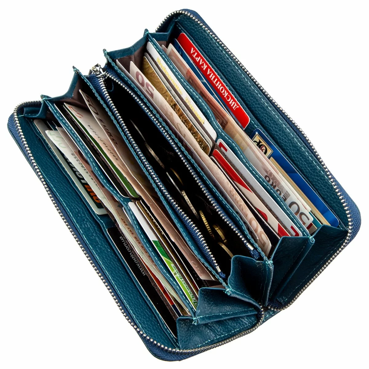 Замечательный многофункциональный клатч для современных деловых женщин. Выполнен из натуральной высококачественной кожи, нежной и мягкой на ощупь. Имеет стильный и модный дизайн, а особый шарм придает кошельку освежающий цвет морской волны. Главной отличительной характеристикой является огромное количество карманов для различных карточек и визиток, таковых есть аж тридцать шесть штук. Поэтому клатч гордо можно называть также и визитницей. Вас непременно порадуют много разных отделений для купюр и других ценностей. Для быстрого доступа к мелочи, монетница расположена на внешней стороне клатча и закрывается на молнию. Упаковано изделие в белую плотную картонную коробку с фирменным логотипом.