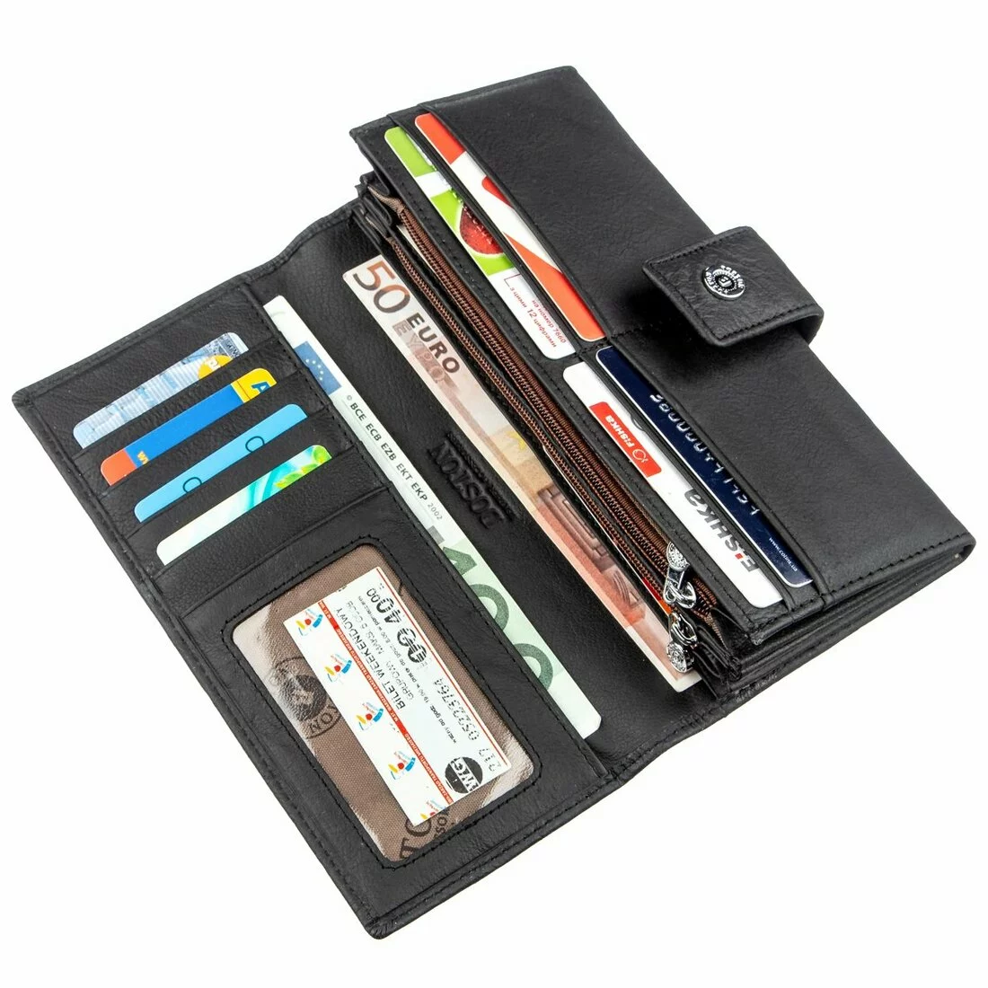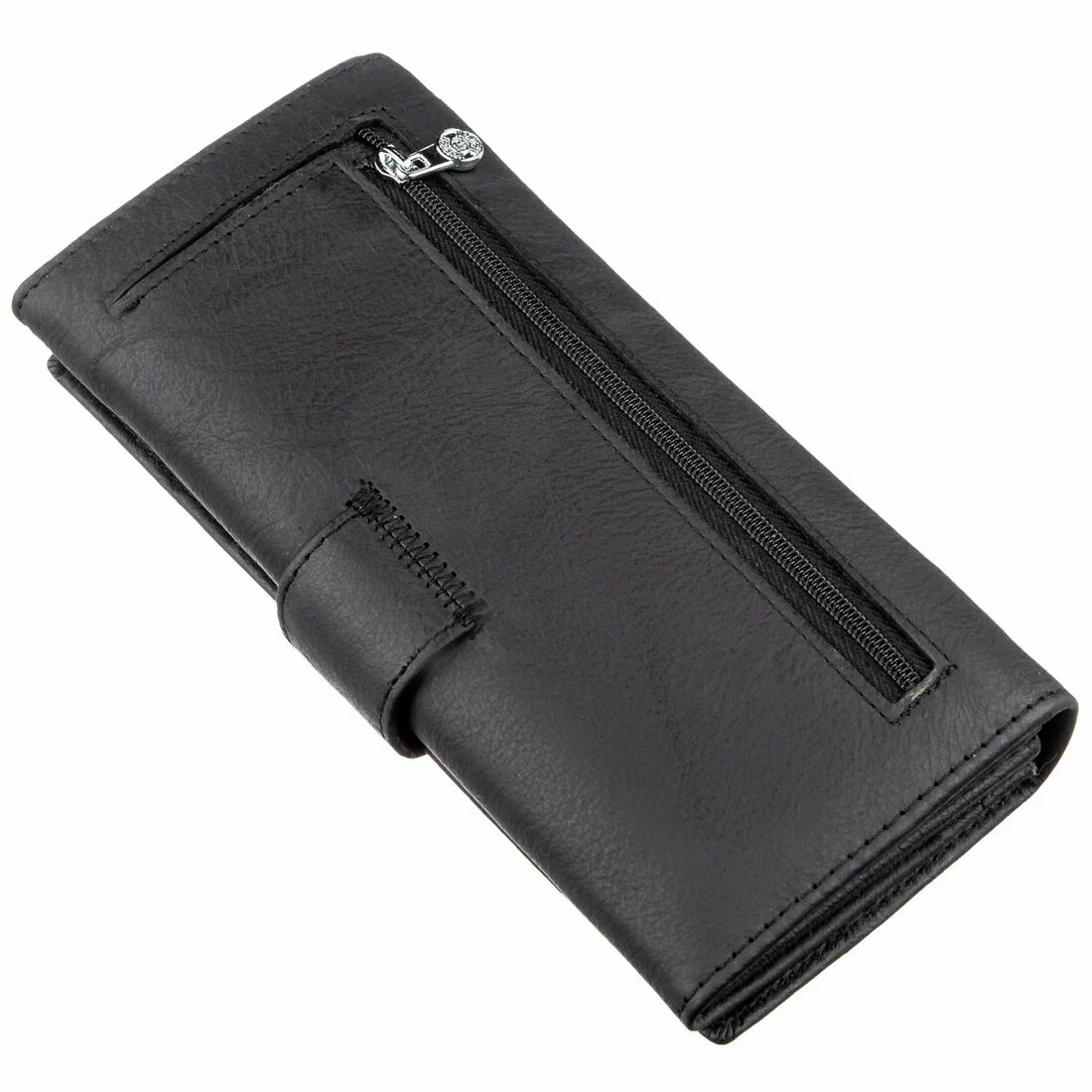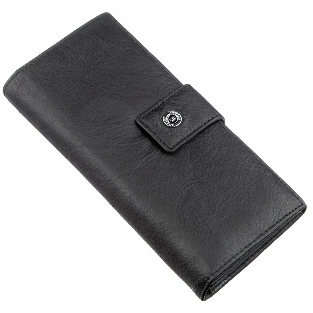 Шикарный женский кошелек из высококлассной натуральной кожи, которая порадует Вас своей мягкой и нежной фактурой. Цвет этого кошелька – черный, который отлично подойдет для прагматичных и деловых женщин любого возраста. В данном аксессуаре есть четыре больших отделения для купюр и документов, отделение на молнии для различных ценностей, карманы для кредитных и визитных карт, а также на тыльной стороне есть отделение для монет или прочих мелочей, которые требуют быстрого доступа к ним. Закрывается кошелек на удобную и практичную кнопку. Упаковано изделие в белую плотную картонную коробку с фирменным логотипом.