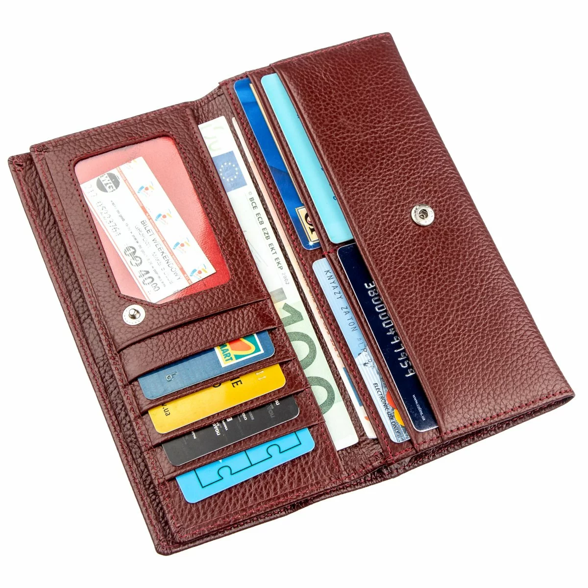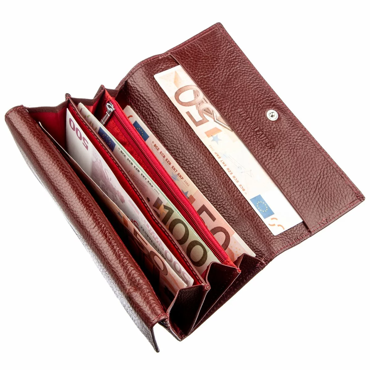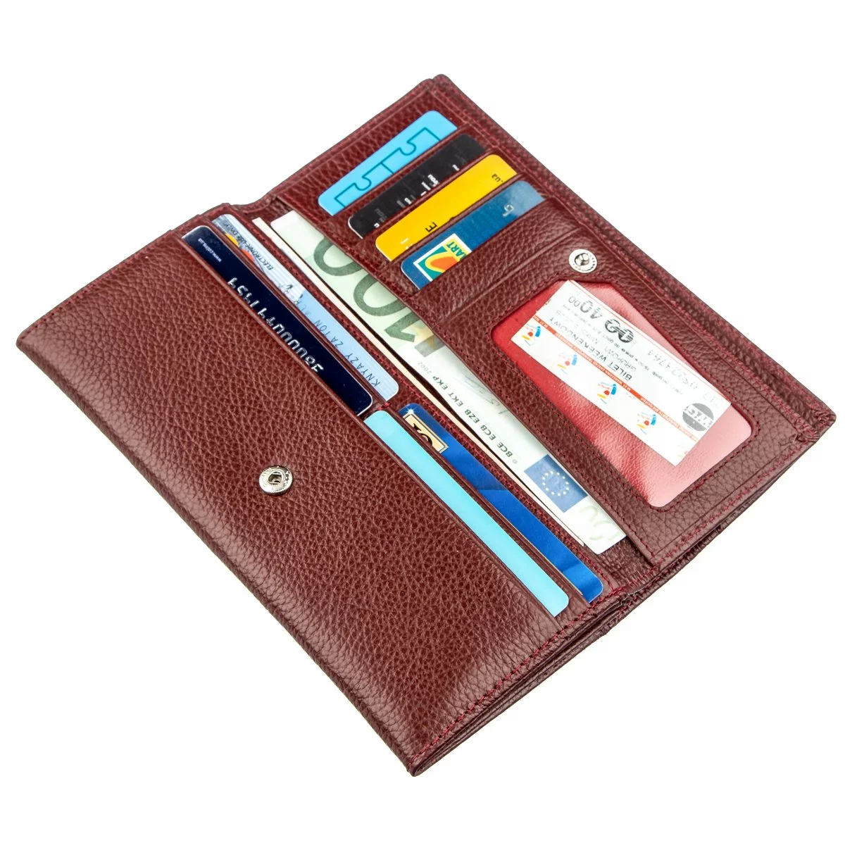 Шикарный кожаный женский кошелек в классическом сдержанном дизайне. Подойдет для стильных и уверенных в себе женщин. Материал изготовления – добротная натуральная кожа с отменными показателями износостойкости и качества. Имеет красивый живописный темно-красный цвет, который придаст любой женщине немного шарма. Основная часть кошелька представлена вместительными отделениями для купюр и документов, монетница расположена на внешней стороне и закрывается на молнию. Визитница закрывается на металлическую кнопку. Данный аксессуар станет прекрасным подарком для любимой женщины. Упакован кошелек в картонную белую коробку с фирменным логотипом.