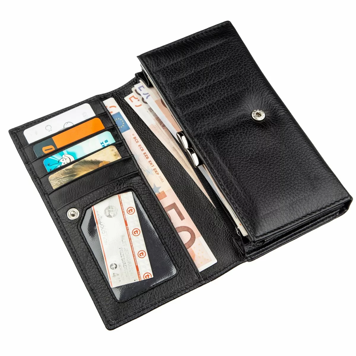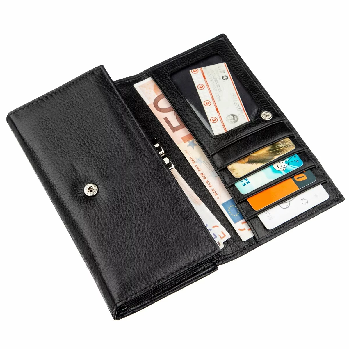 Превосходный женский кошелек из натуральной кожи высочайшего качества, которая прослужит Вам долгое время. Имеет мягкую и нежную на ощупь зернистую фактуру. Цвет изделия – черный, который по всеобщему признанию является самым практичным. Внутри кошелька расположено три основных отделения, монетница на металлической защелке, прозрачный карман для фото и отделения для карт. На тыльной стороне – визитница на одиннадцать карманов и потайное большое отделение. Закрывается визитница на кнопку, которую можно регулировать по длине. При покупке данный аксессуар упакован в картонную фирменную коробку.