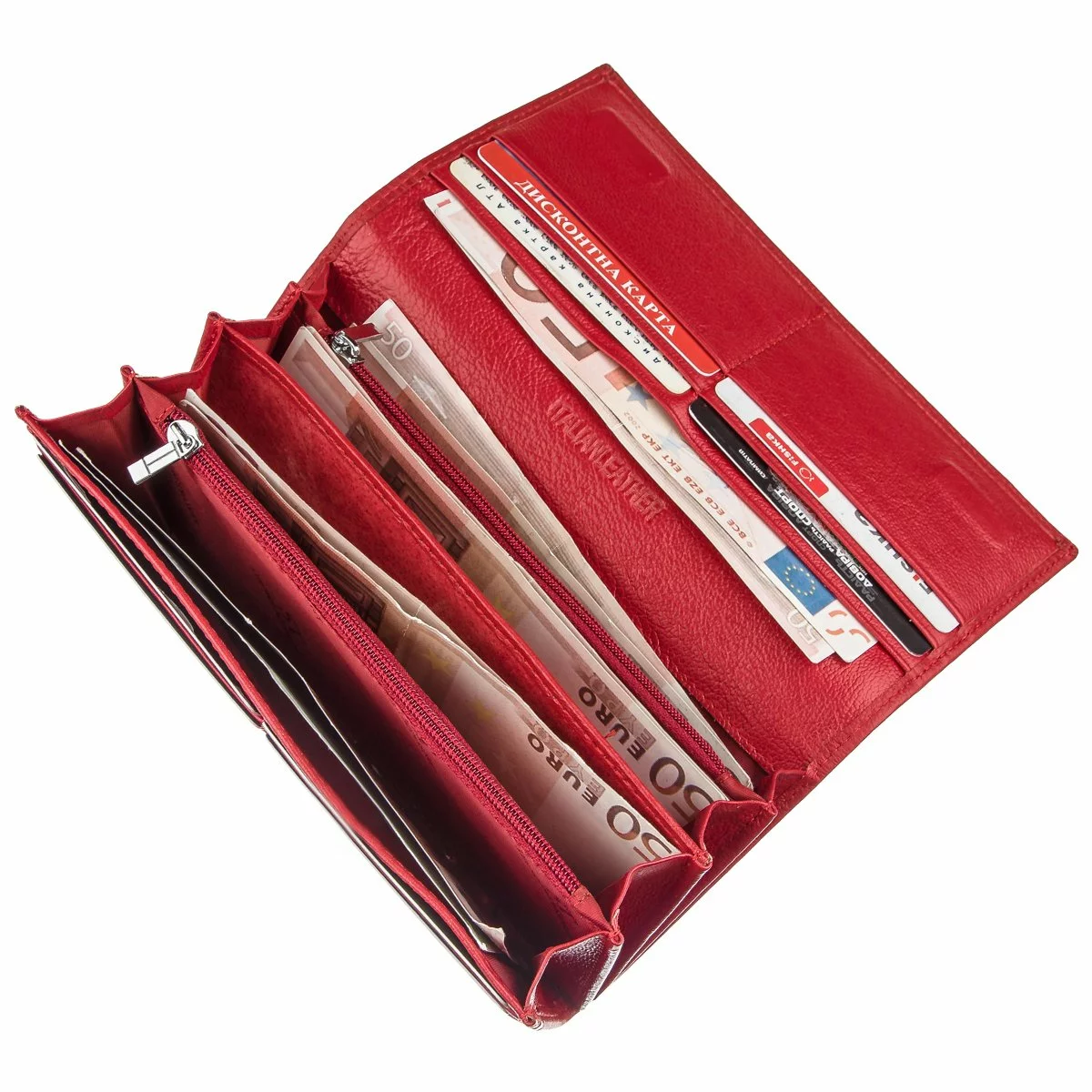 Яркий вместительный женский клатч из натуральной кожи мягкой и приятной на ощупь. Аксессуар выполнен в красном цвете, который однозначно выделит вас из толпы и подчеркнет вашу индивидуальность. Прошит по краям кошелек ровной строчкой красного цвета. Клатч станет незаменимым помощником для любой девушки и прекрасным подарком. В модели используется только качественная проверенная фурнитура серебристого цвета. На лицевой стороне аксессуара металлический логотип бренда. В комплекте к товару идет фирменная картонная коробка белого цвета.