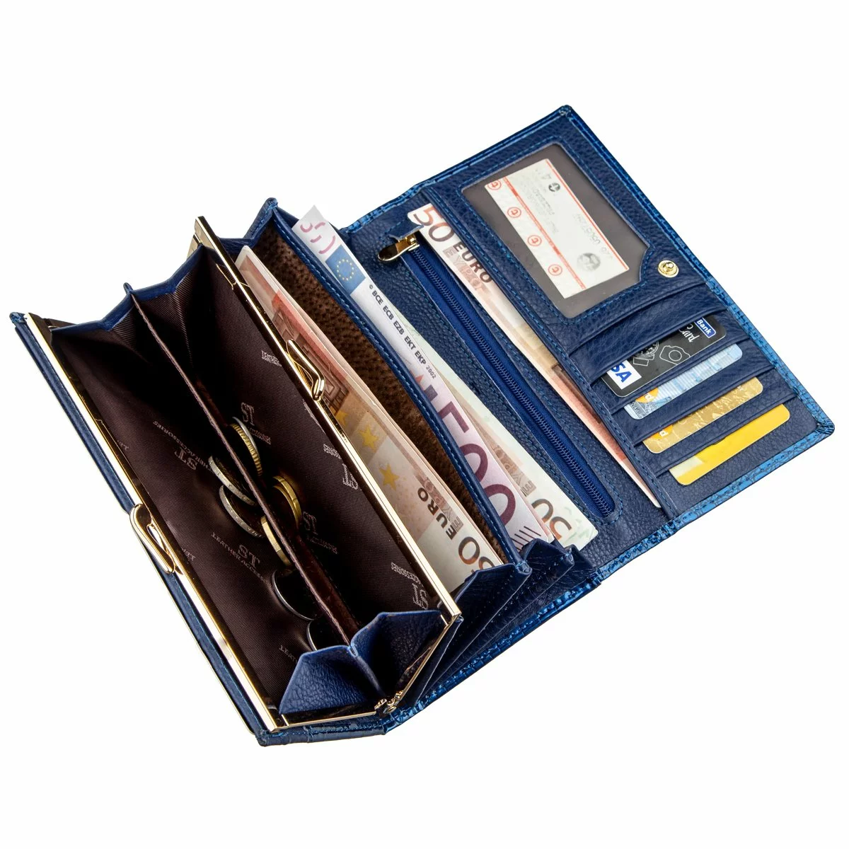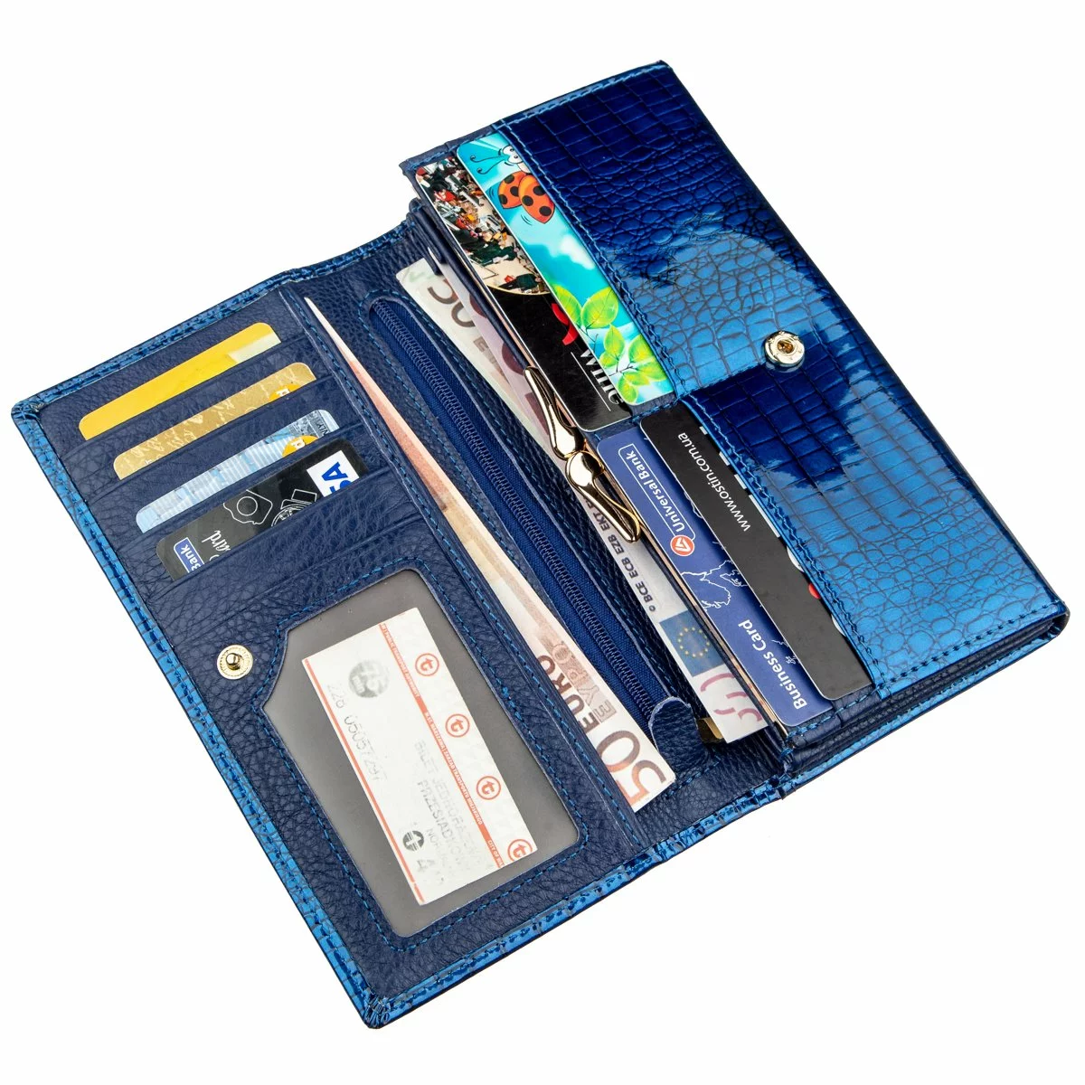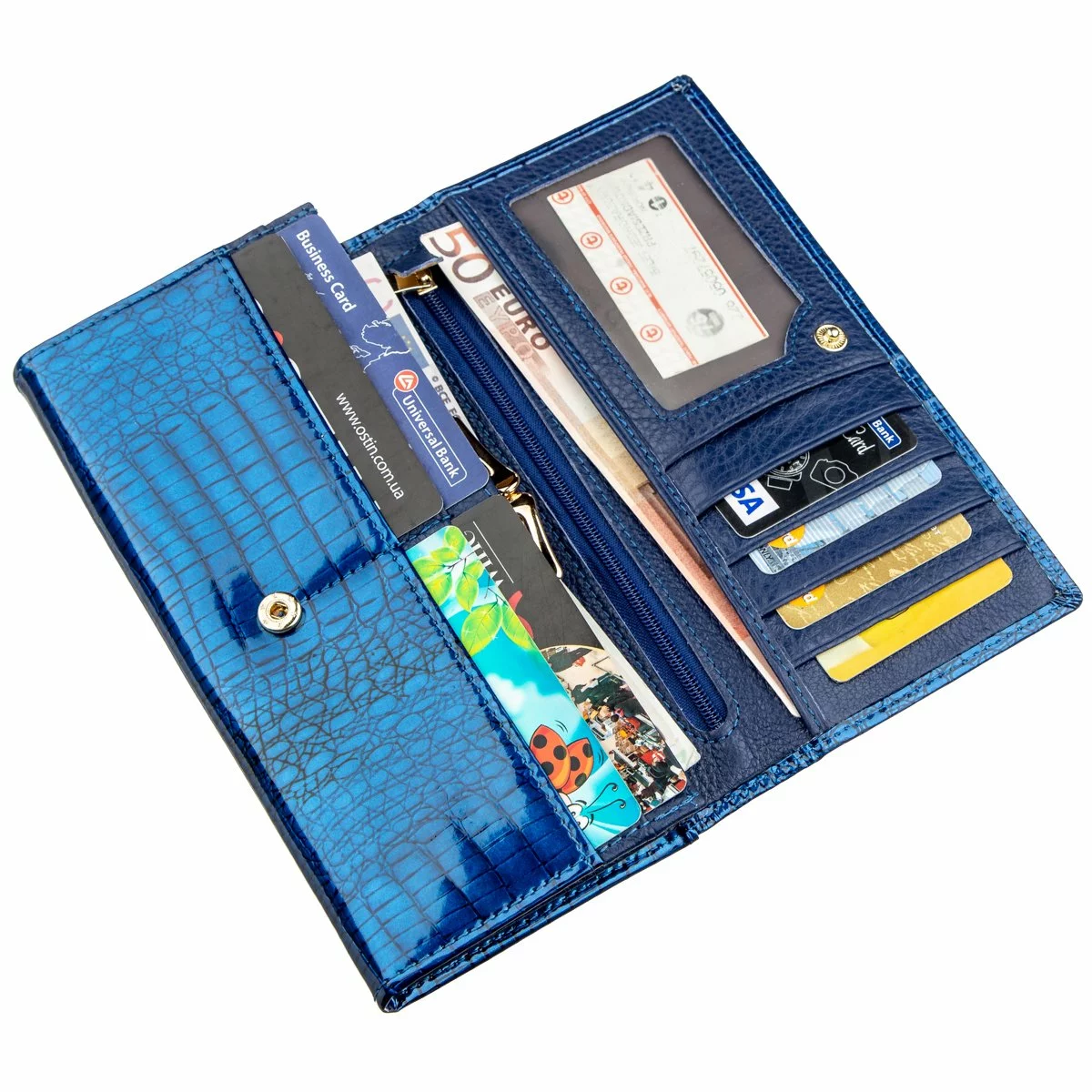 Изысканный женский кошелек в классическом стиле для женщин любого возраста. Сделан аксессуар из натуральной первосортной кожи, которая мягкая и гладкая на ощупь, а также покрыта лаком. Поэтому смотрится изделие очень красиво и фешенебельно. Цвет кошелька – насыщено синий с голубым отливом. Наполнение кошелька тоже можно сказать - классическое. Это отделения для купюр и банкнот, для необъемных документов, отделения для монет и прочей мелочи, а также карманы для визитных и кредитных карт. Дынный аксессуар непременно станет отличным подарком не только самой себе, но и для другого близкого человека, особенно если есть повод. Упаковка представлена в виде плотной фирменной картонной коробки.