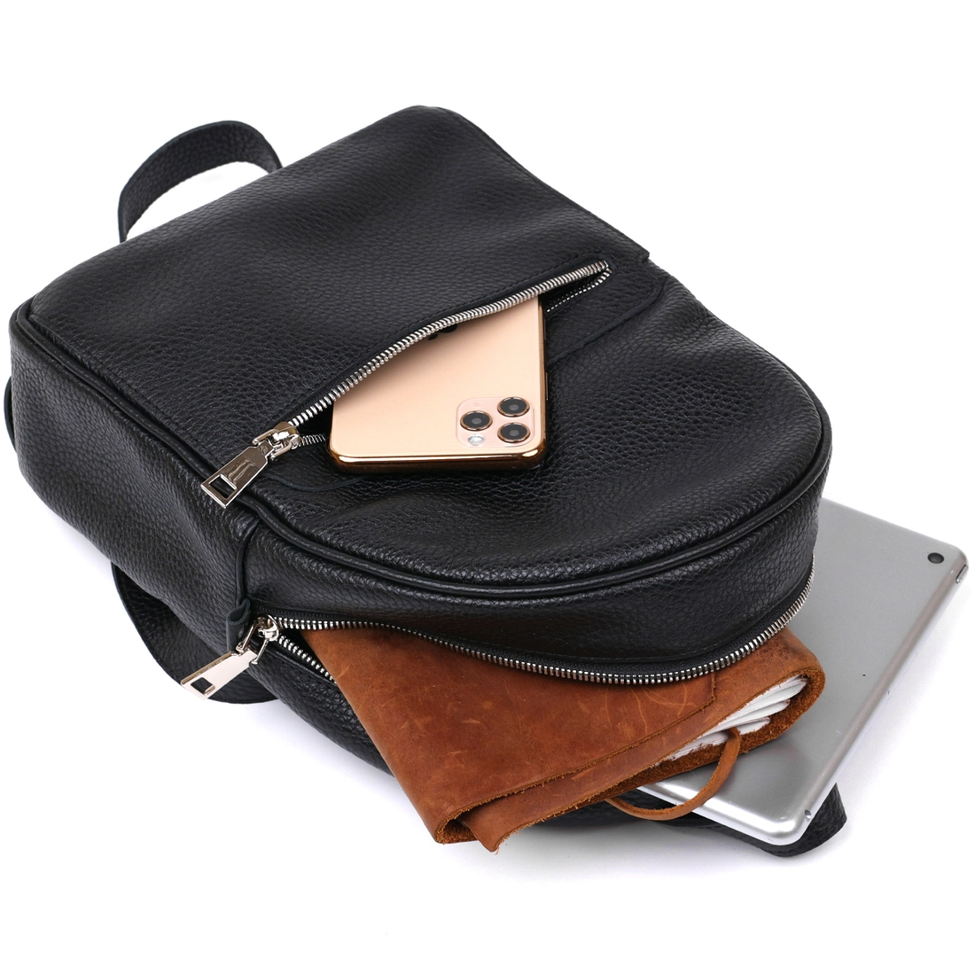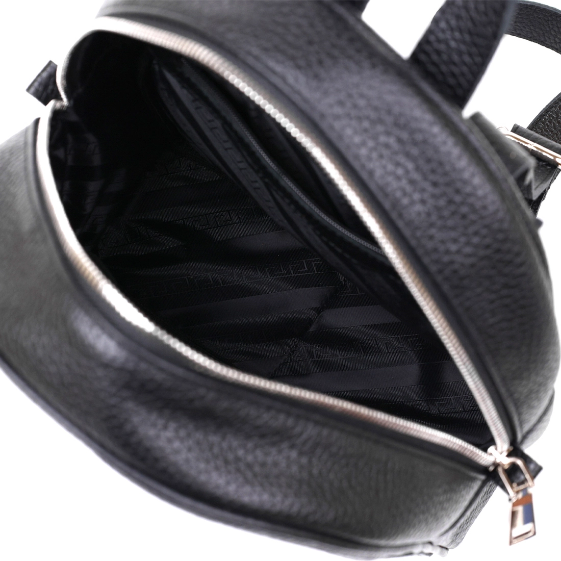 Практичный женский рюкзак из натуральной кожи высокого качества исполнения. Имеет зернистую фактуру и универсальный черный цвет, поэтому подойдет под любую одежду. Основное отделение очень вместительное и просторное, на внешний стороне предусмотрен небольшой карман на молнии.