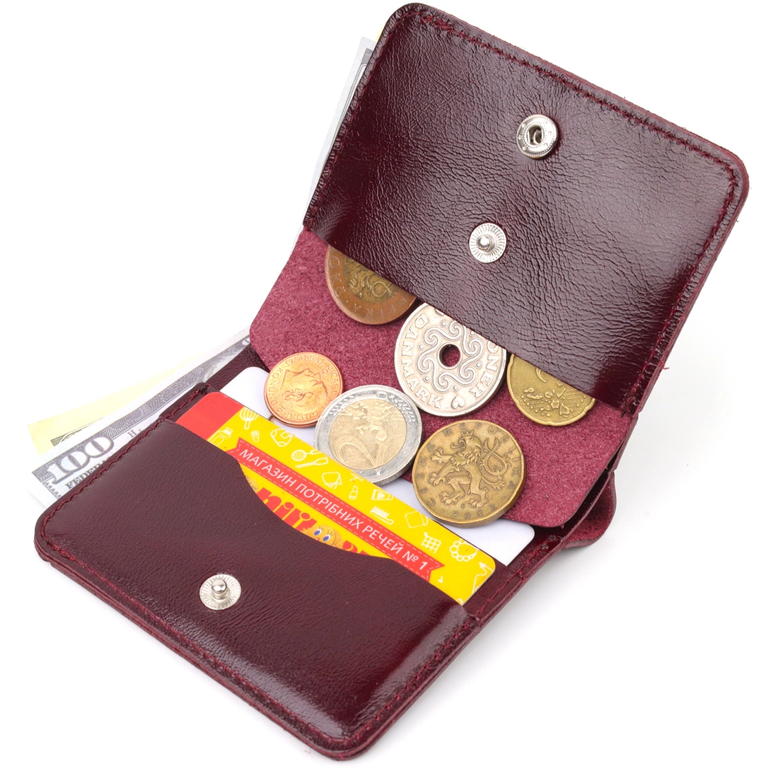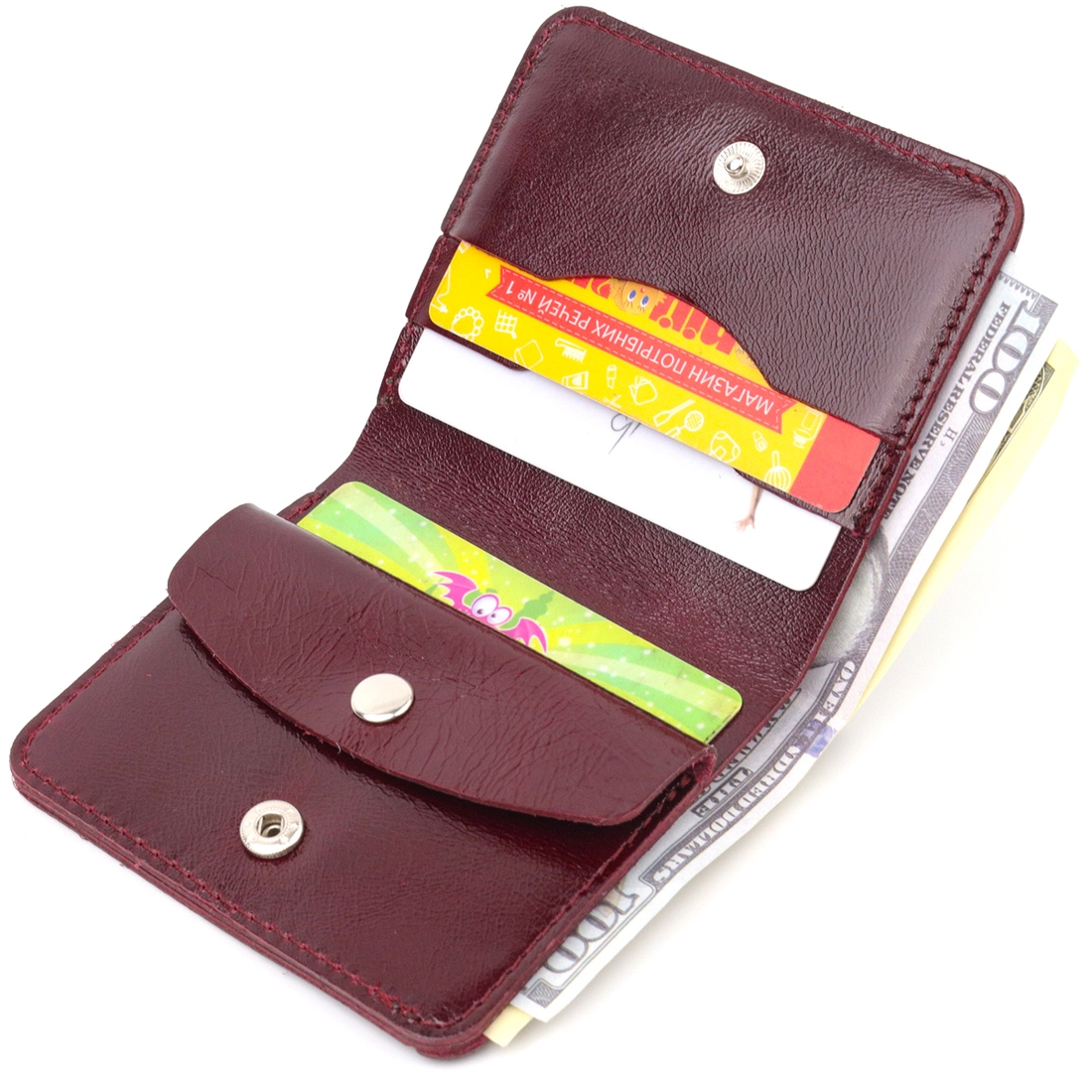 Яркое женское портмоне в современном дизайне и красивом вишневом цвете. Выполнено изделие из натуральной глянцевой кожи высокого качества и отличной устойчивости к износу. Портмоне имеет вместительное отделение для купюр, слоты для пластиковых карточек и монетницу. Закрывается аксессуар на кнопку. Если вы подыскиваете подарок для яркого близкого человека, то данная модель отлично для этого подойдет.
