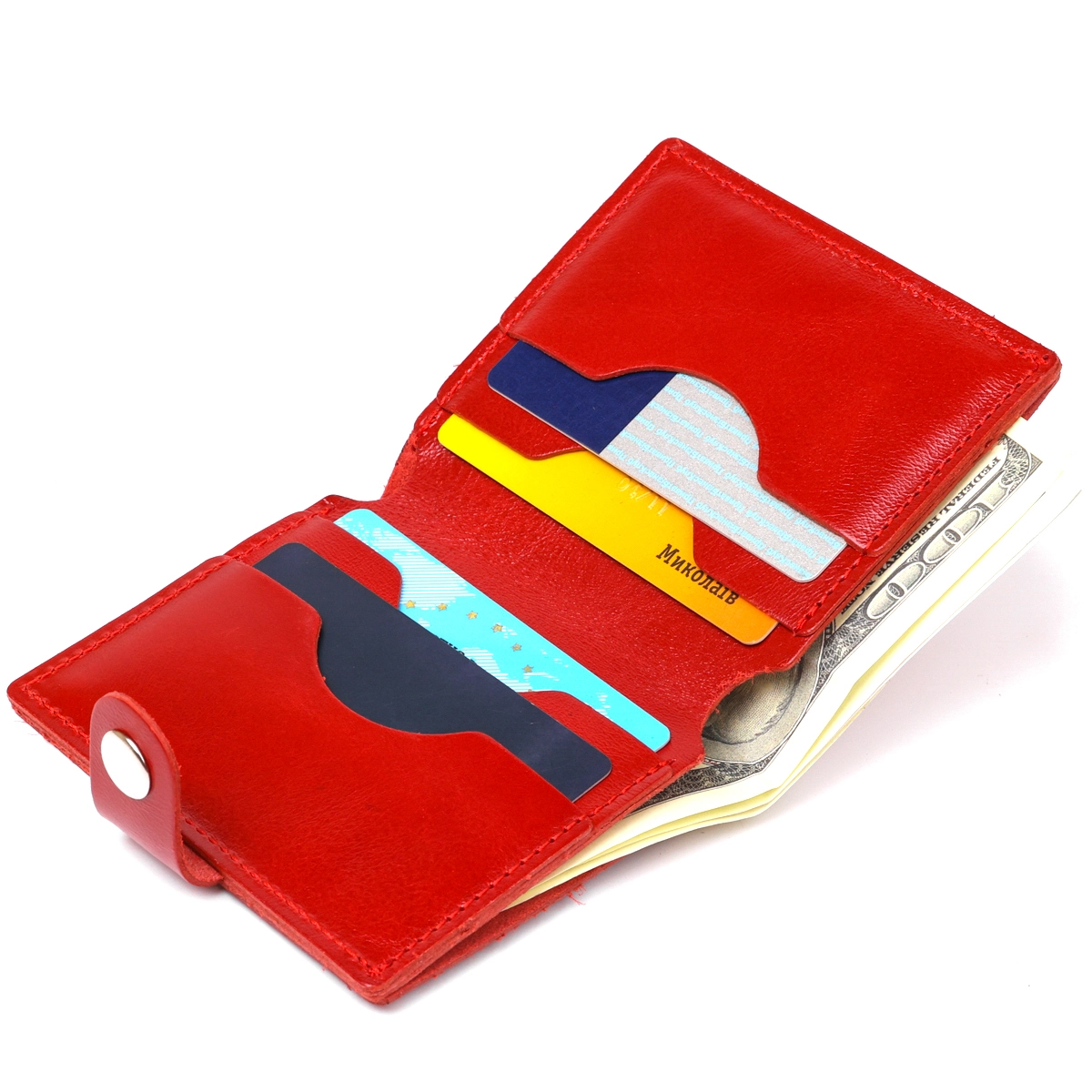 Замечательное женское портмоне в красивом красном цвете и стильном дизайне. Имеет просторное основное отделение и слоты для пластиковых карточек. Выполнено изделие из натуральной кожи высокого качества и отличными характеристиками. Закрывается данная модель на хлястик с кнопкой, что очень удобно и практично.